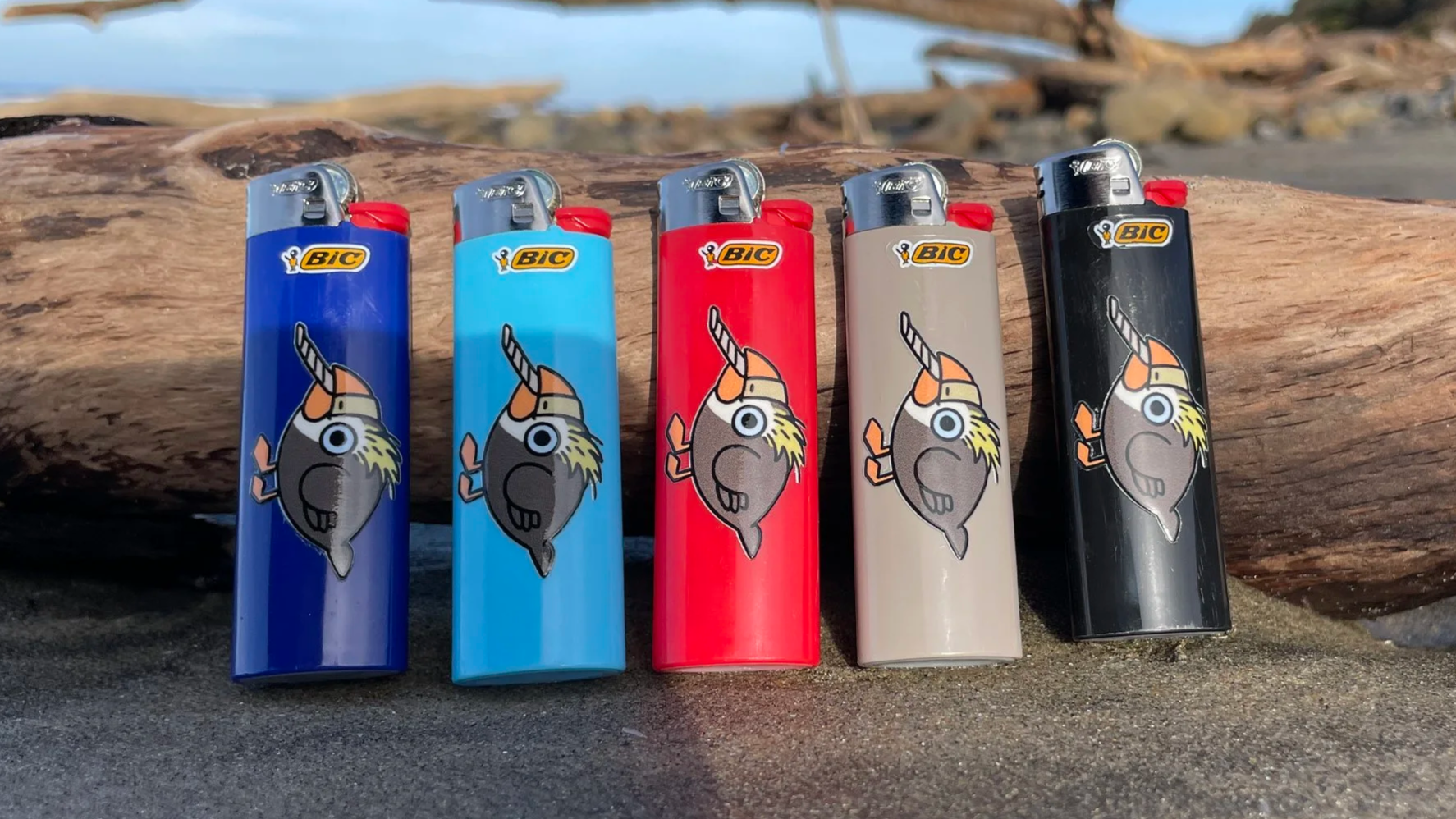 These Bic disposable lighters come in 5 color options, with unique hand-drawn graphic decals on both sides! Little Auk Co recommends the light blue lighters, as the color matches the eyes of an adult tufted puffin.